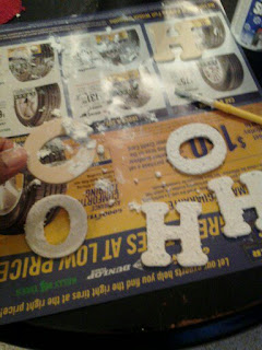 Last, I got my wooden letters and painted them with my Deco art snow paint (that I’m using for another D.I.Y that I found on pinterest) painted them and then glued it to my wreath.