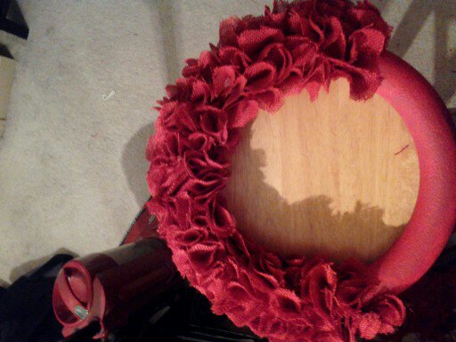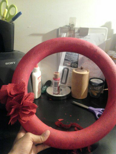 I bought a white styrofoam wreath and immediately started adding burlap rosettes to it and realized that you could see the white through the burlap. So, I was trying to figure out a way to cover up the white so I was searching and found a blog where a woman had spray painted her wreath red so when she added the rosettes you couldn’t see white. I can’t remember what blog it was but thanks so much!!!! So, I realized I had some red paint from when I painted my “L” on my fall wreath. I started painting it and I only had a really tiny paint brush so it took forever . I painted it and let it dry and I decided to finish it the next day.