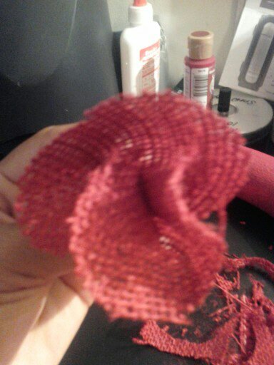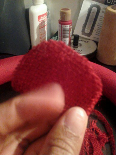 Now I am at the half way mark on day 1 1/2 and this is when I had to stop and go back to Hobby Lobby to get more Burlap. My finger was blistered by this point, my wrist was hurting, and my hand was completed tired from all of the cutting to make the circles.